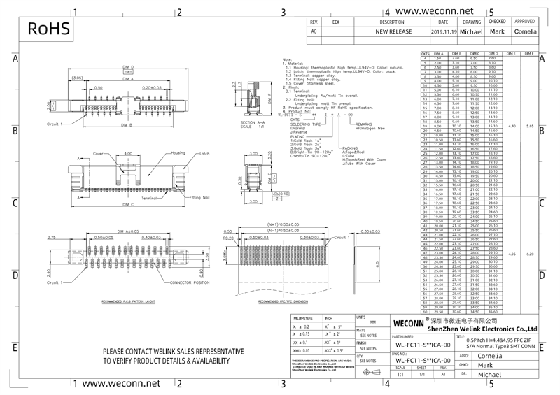 Specifications: 0.5Pitch H2.0 FPC/FFC Easy-on R/A Type5 SMT CONN