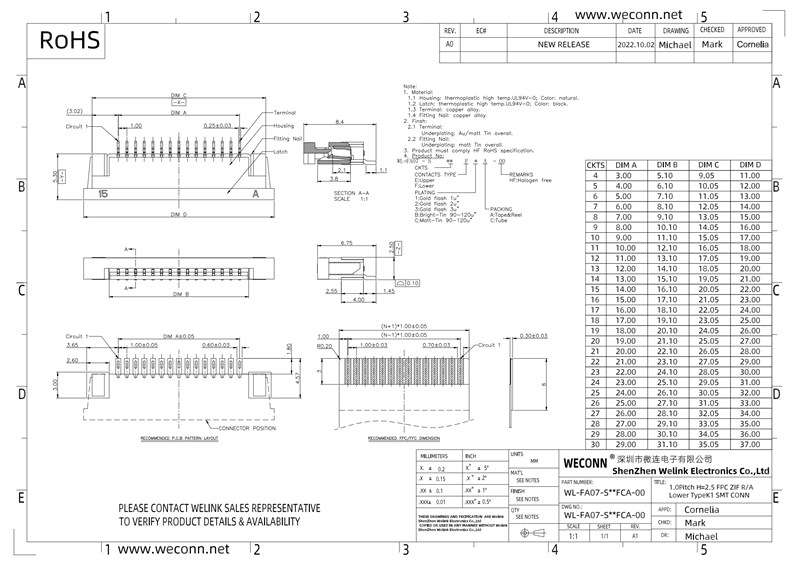 Specifications: 1.0Pitch H=2.5 FPC ZIF R/A Lower TypeK1 SMT CONN