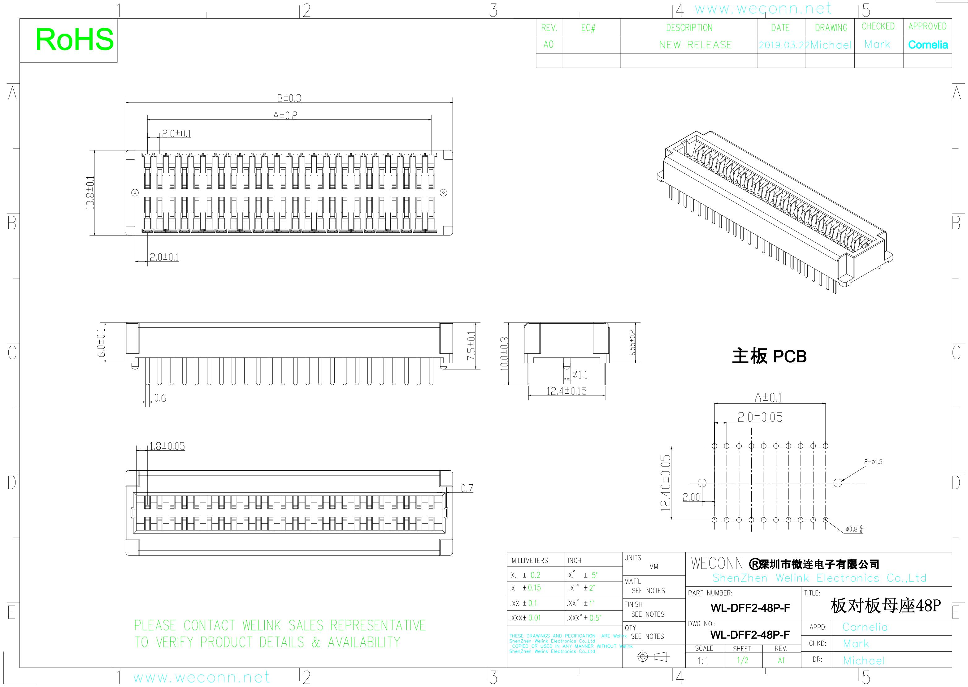 • Product name: Automotive connector Board To Board Connector. Number:WL-DFF2-48P-F. Specifications:2.0Pitch, 12Pin,48Pin,50Pin. female connector.