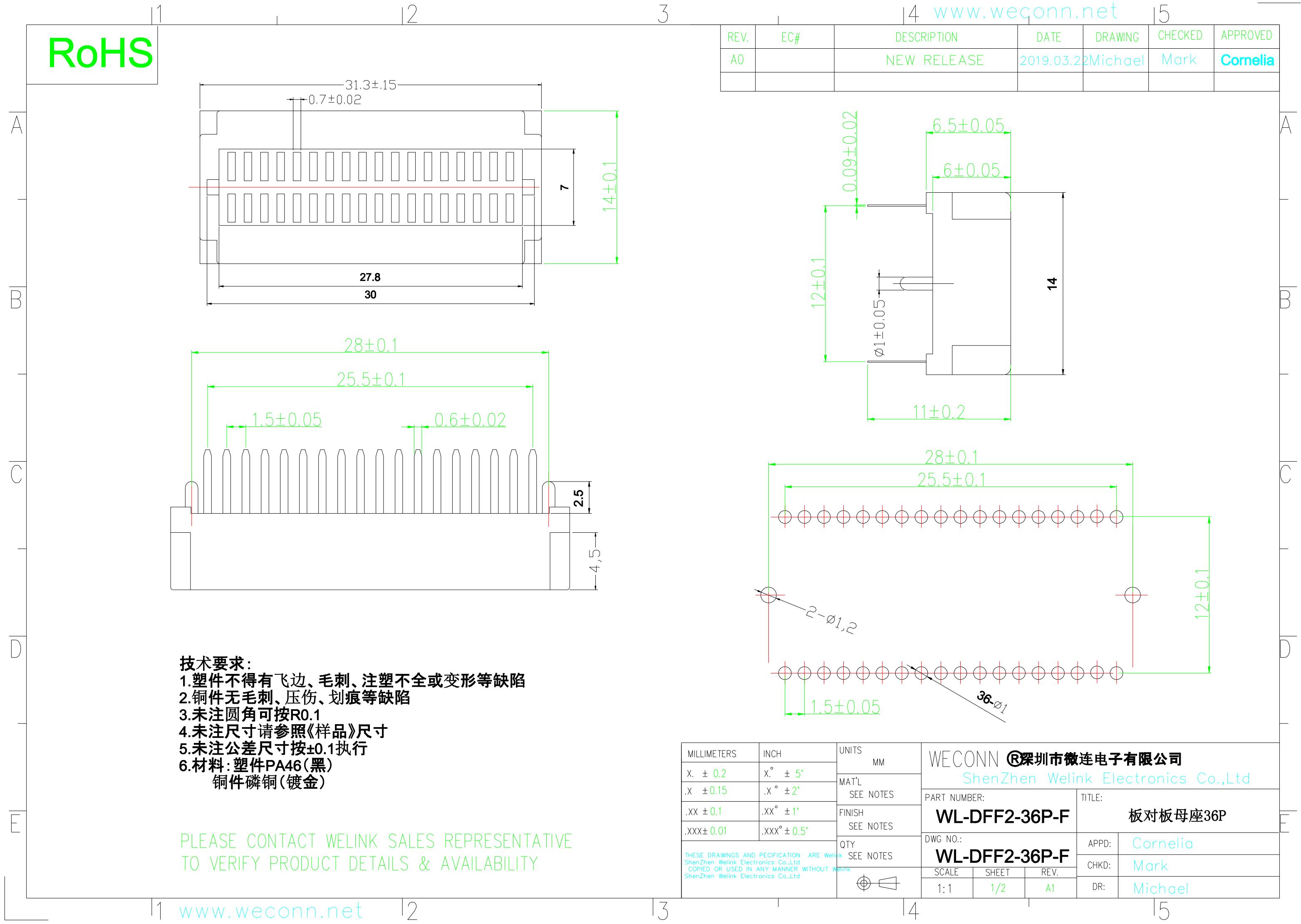 • Product name: Automotive connector Board To Board Connector. Number:WL-DFF2-36P-F. Specifications:1.5Pitch, 36Pin. female connector.